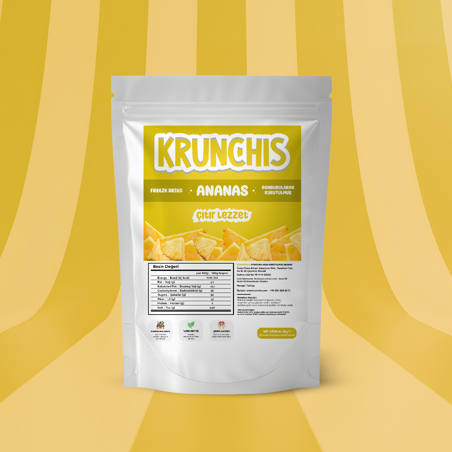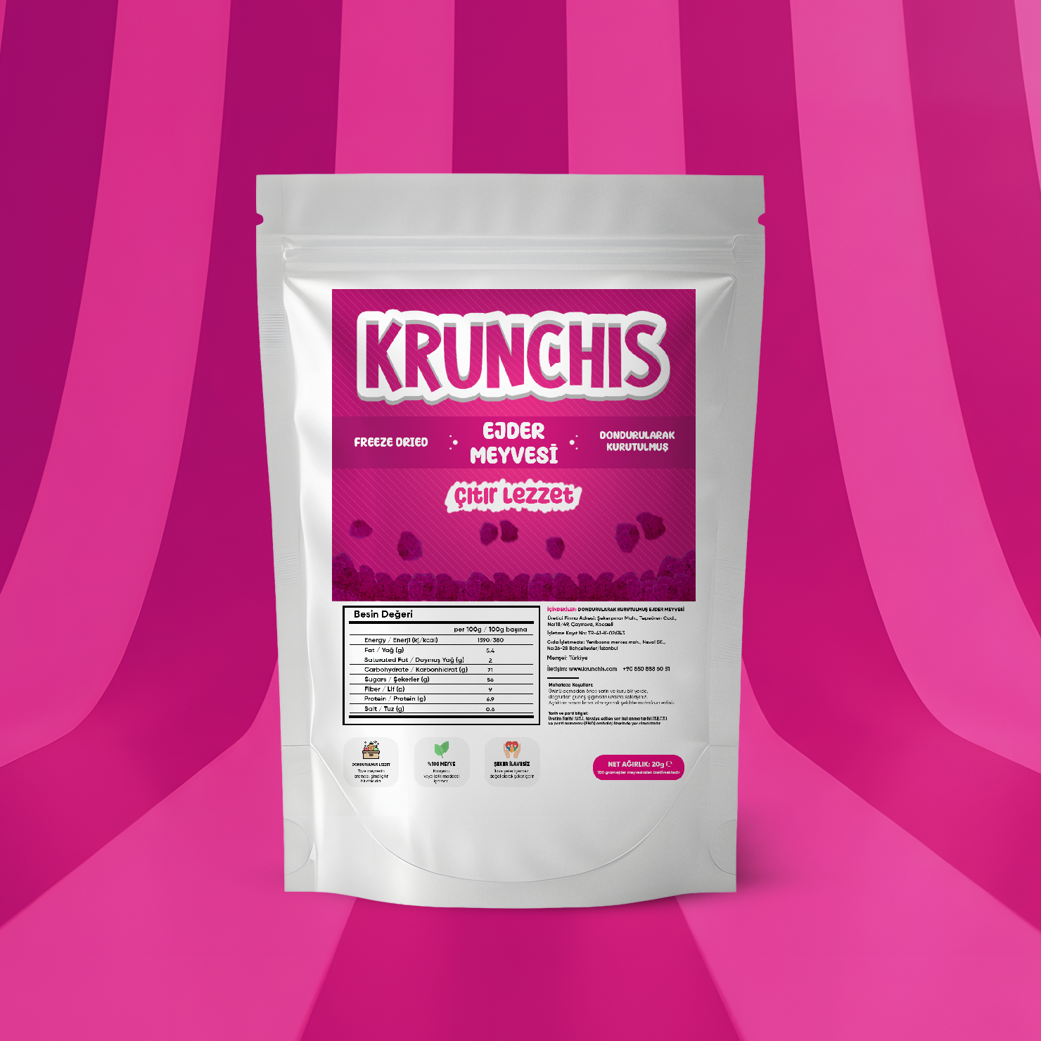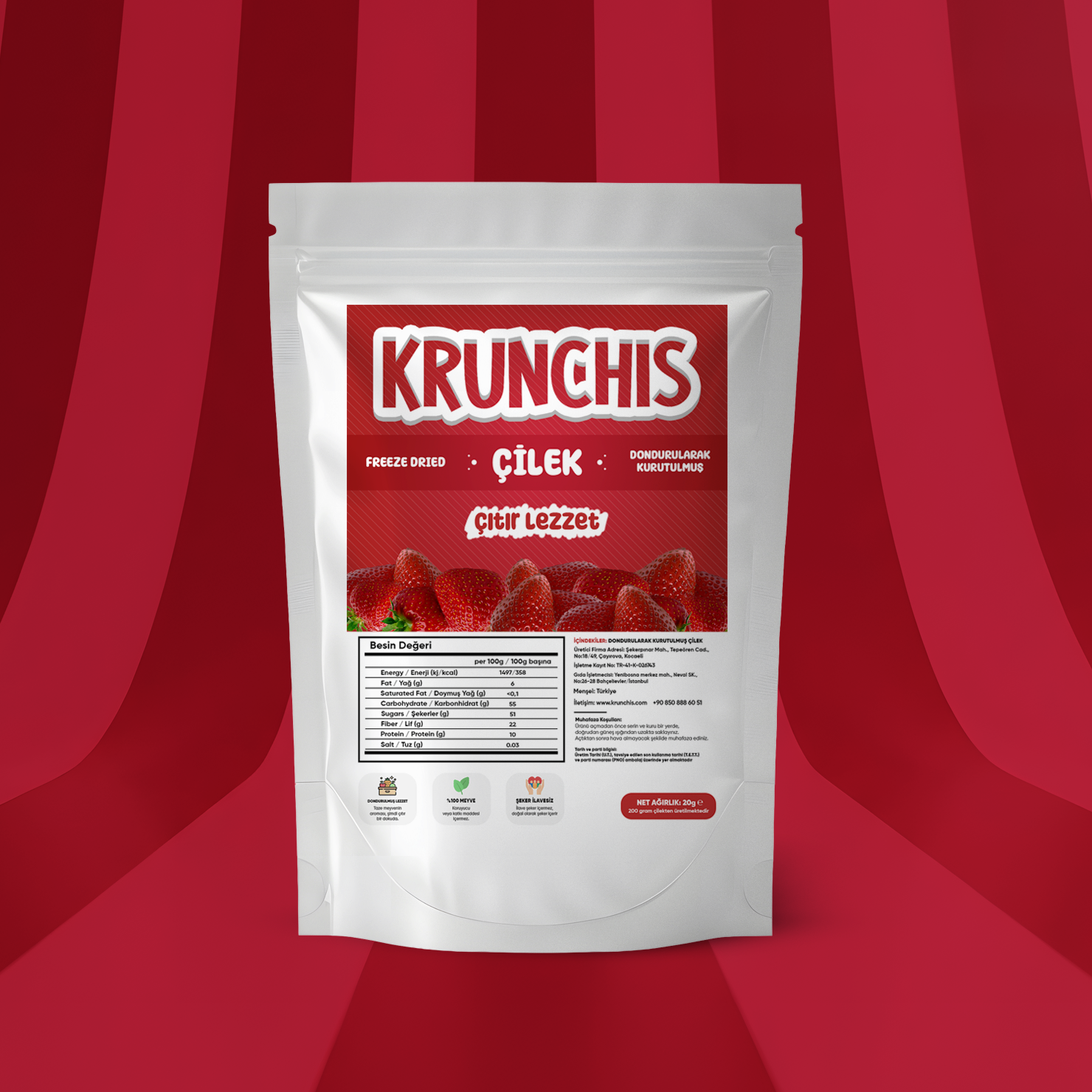 Her bir meyve, tazeliğini ve yoğun aromasını koruyacak özel dondurarak kurutma yöntemiyle hazırlanır. Böylece ilk ısırıkta hem kıtırlığı hem de meyvenin gerçek tadını net şekilde hissedersiniz.